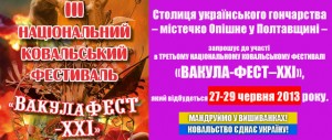 Якщо ви цікавитеся українським гончарством, обов’язково завітайте на Ковальський фестиваль ВакулаФест 2013! Захід відбудеться 27 – 29 червня у Мистецькій галереї Центру розвитку духовної культури Національного музею-заповідника українського гончарства в Опішному: Полтавська область, Опішне, вул. Заливчого, 3. Деталі – за телефоном: (050) 854-7два-85 (куратор фесту Ірина Іващенко).