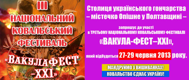 З 27 до 29 червня у гончарній столиці України – селищі Опішне – триватиме ІІІ Національний ковальський фестиваль «ВакулаФест–ХХІ». Захід проведуть у рамках V Тижня Національного Гончарного Здвиження в Опішному «Здвиг 2013».